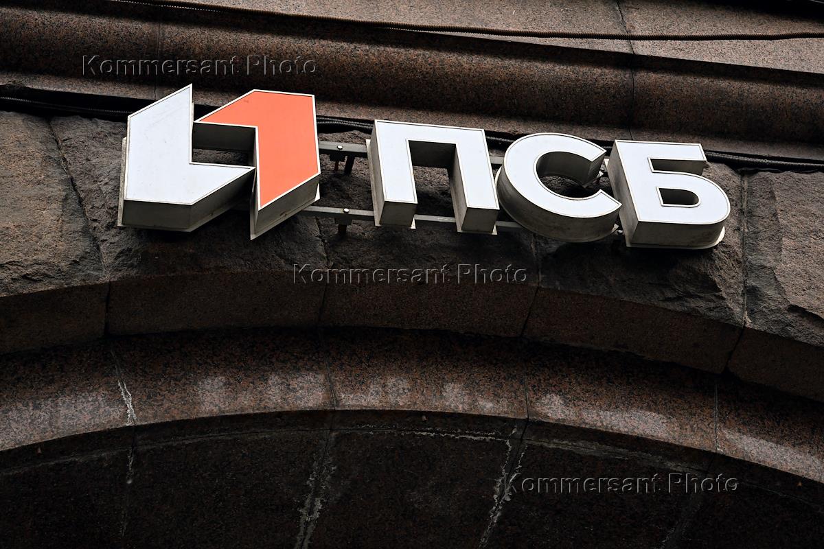 The work of Promsvyazbank's branch - the additional office "Dorogomilovsky" on Kutuzovsky Prospekt, 18. Genre photography. A sign above the entrance.