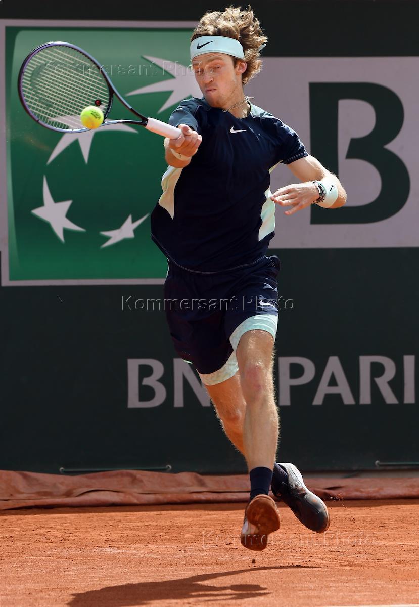 Открытый чемпионат Франции по теннису "Ролан Гаррос" 2022 (Roland Garros 2022). Российский теннисист Андрей Рублев во время матча с корейским теннисистом Квон Сон У.