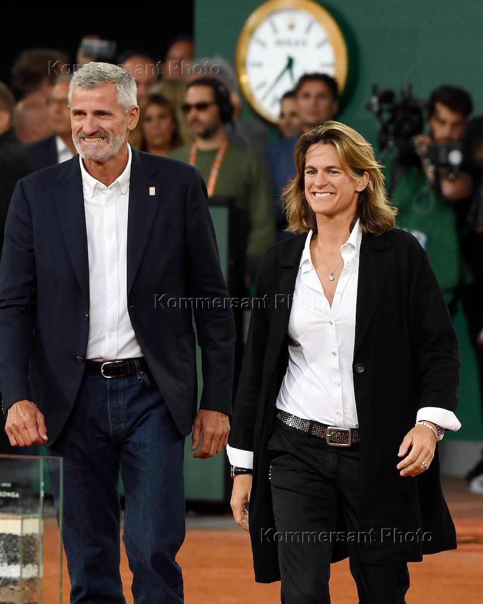 Открытый чемпионат Франции по теннису "Ролан Гаррос" 2022 (Roland Garros 2022). Первый круг. Бывшая французская теннисистка, тренер по теннису Амели Моресмо (справа) во время церемония прощания с теннисом французского теннисиста Жо-Вилфрид Цонга после окончания его матча с норвежским теннисистом Каспером Рууд.