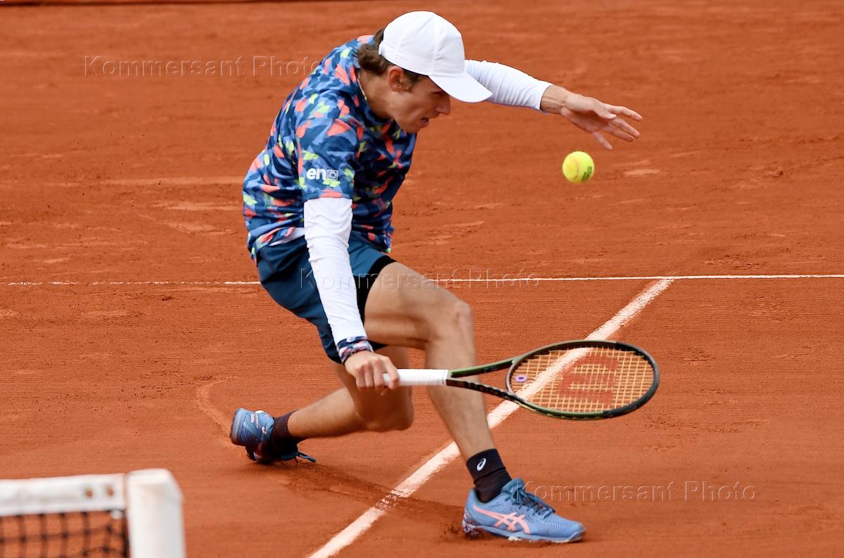 Открытый чемпионат Франции по теннису "Ролан Гаррос" 2022 (Roland Garros 2022). Первый круг. Австралийский теннисист Алекс Де Минор во время матча с французским теннисистом Юго Гастоном.