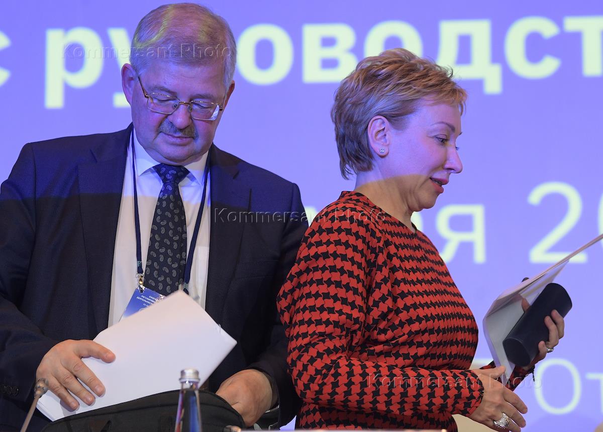 The annual meeting of credit institutions with the leadership of the Central Bank of Russia and its structural divisions on the regulation of the activities of commercial banks, organized by the Association of Banks of Russia (ABR) in the "AZIMUT Hotel Olympic". First Deputy Governors of the Central Bank of Russia Dmitry Tulin (left) and Olga Skorobogatova (right) during a meeting.
