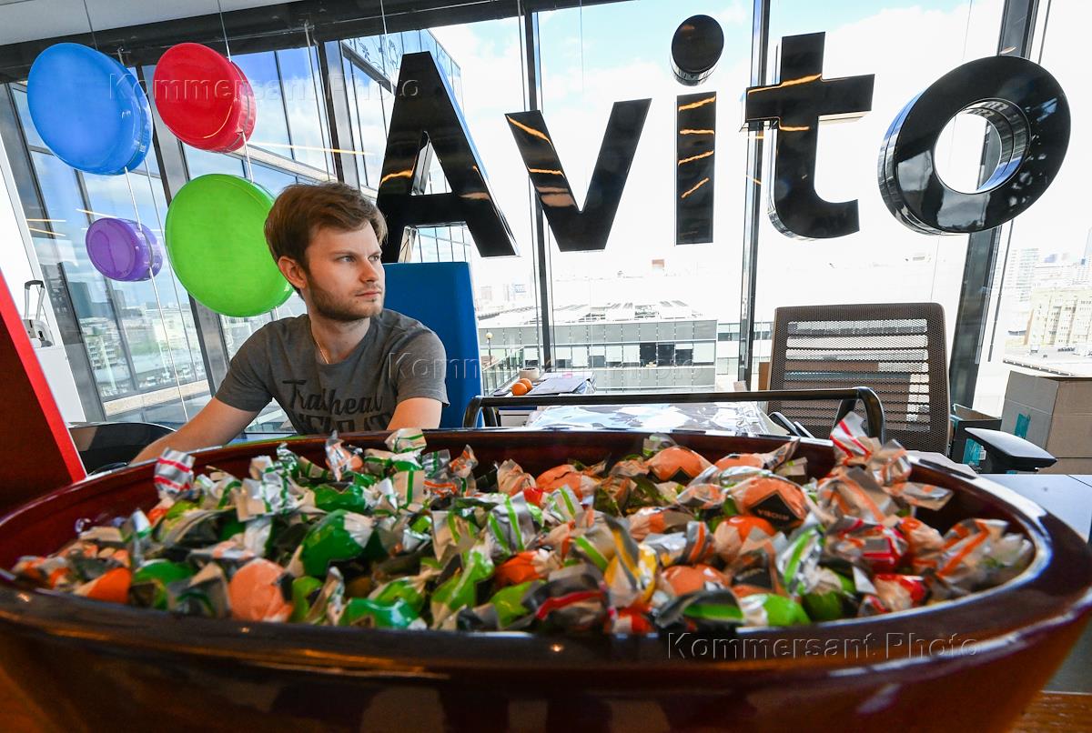 The work of the office of the Internet service Avito on Lesnaya Street. Genre photography. Employee during work. Office sign.