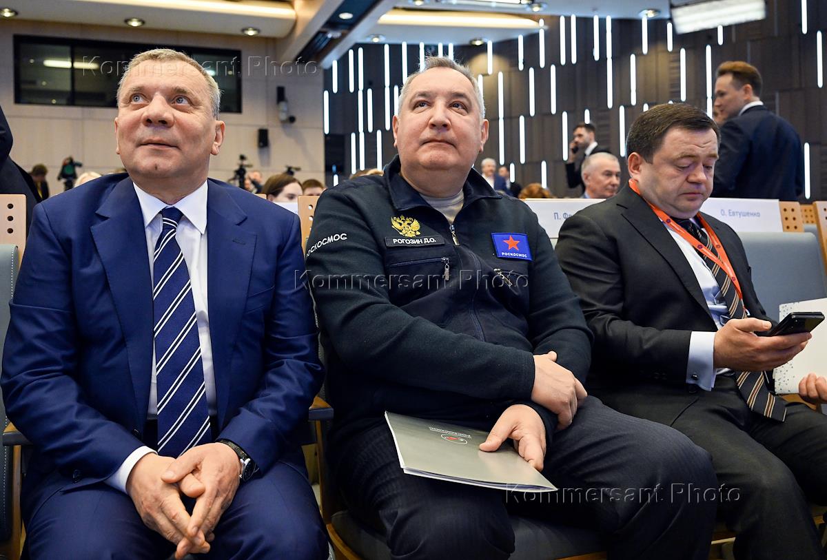 Национальный промышленный саммит "Промышленная политика в новых реалиях" в МИА "Россия сегодня". Слева направо: заместитель председателя правительства России Юрий Борисов, генеральный директор Государственной корпорации по космической деятельности "Роскосмос" Дмитрий Рогозин и председатель ПАО "Промсвязьбанк" Петр Фрадков на саммите.