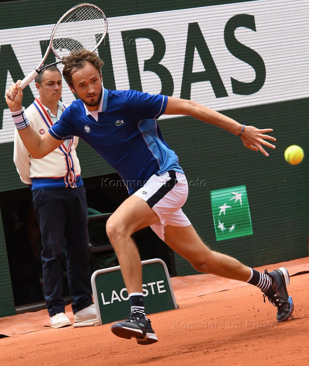 Чемпионат Франции по теннису "Ролан Гаррос" 2022 (Roland Garros 2022). Второй круг. Российский теннисист Даниил Медведев во время матча с сербским теннисистом Ласло Джере.