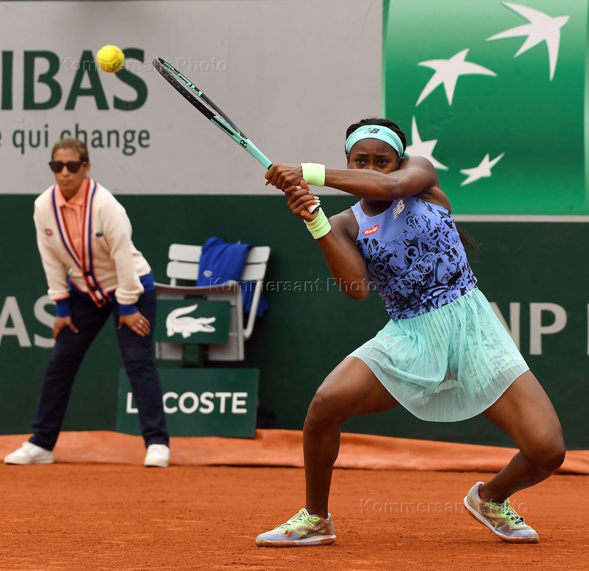 Чемпионат Франции по теннису "Ролан Гаррос" 2022 (Roland Garros 2022). 3-й круг. Американская теннисистка Кори Гауфф во время матча с эстонской теннисисткой Кайей Канепи.