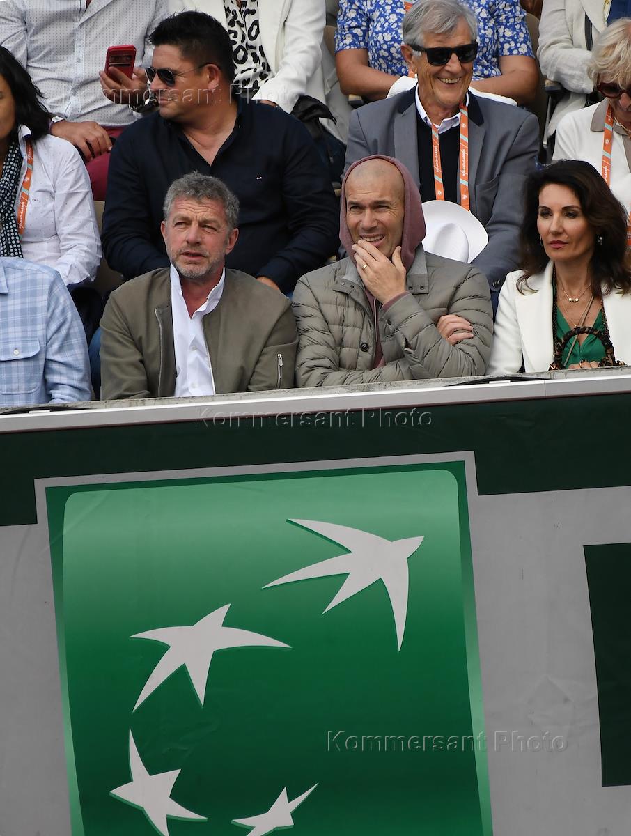Чемпионат Франции по теннису "Ролан Гаррос" 2022 (Roland Garros 2022). Третий круг. Тренер по футболу Зинейдин Зидан (в центре) с супругой Вероникой Лентиско-Фернандес (справа) трибуне во время Чемпионата.