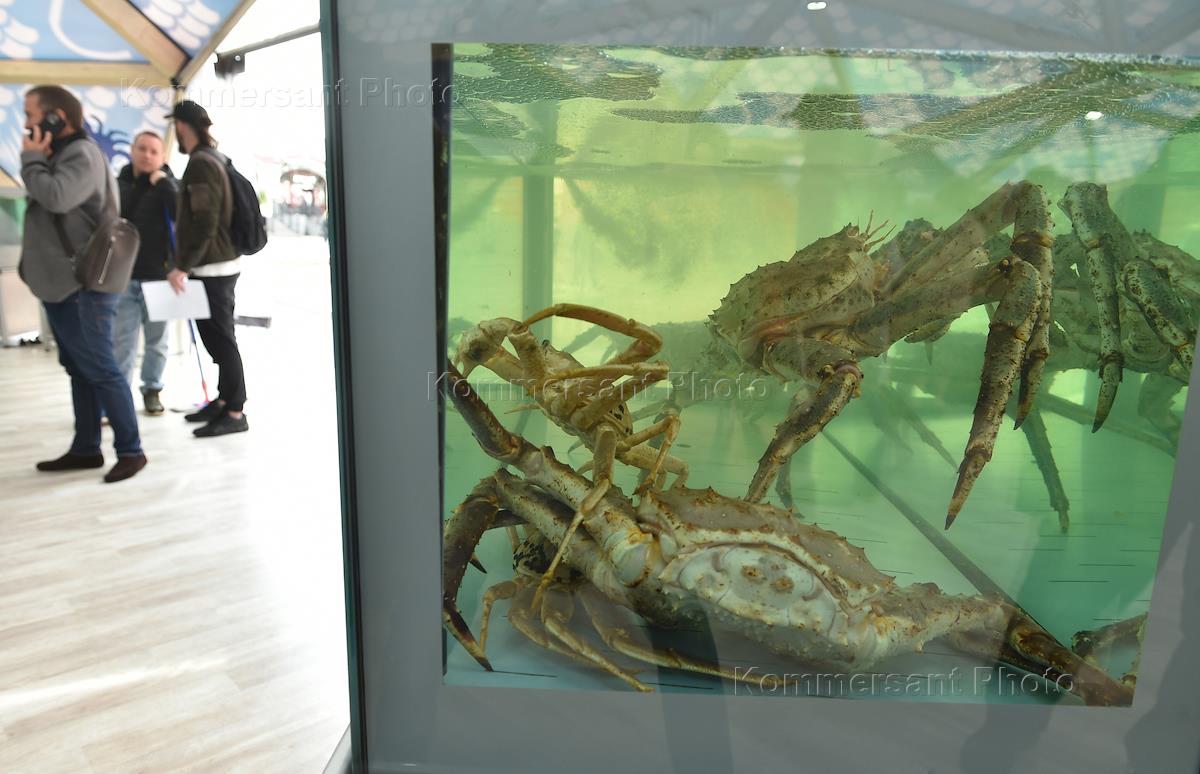 Шестой гастрономический монофестиваль "Рыбная неделя в Москве" на Манежной площади. Жанровая фотография. Камчатский краб в аквариуме.