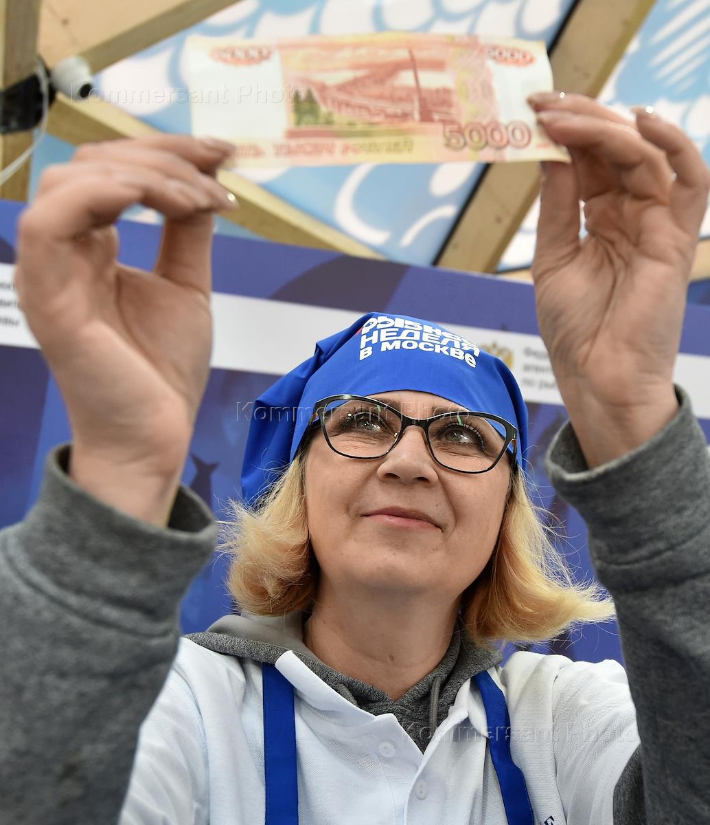 The sixth gastronomic mono-festival "Fish Week in Moscow" on Manezhnaya Square. Genre photography. The seller holds a banknote of 5000 rubles in his hands.