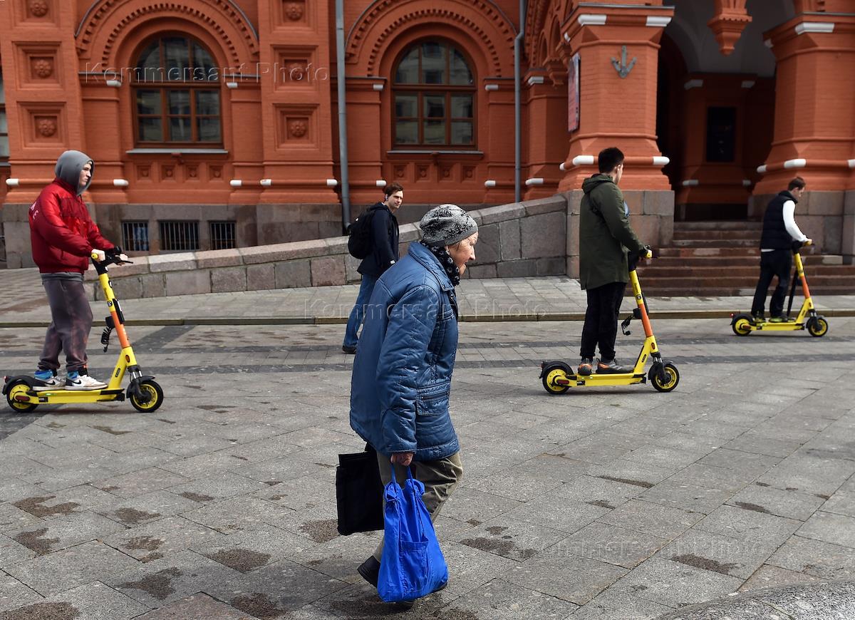 Жанровая фотография. Люди катаются на прокатных электросамокатах на Манежной площади у здания Исторического музея.