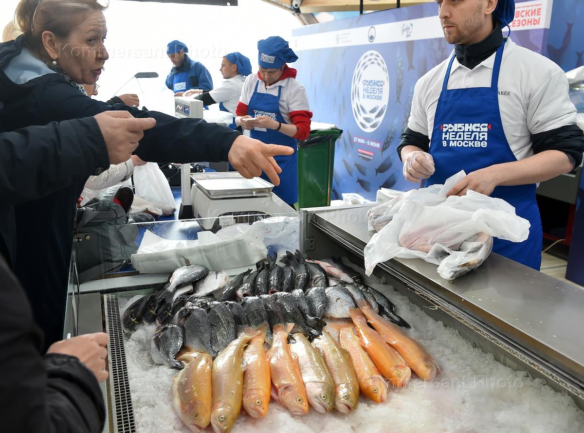 Шестой гастрономический монофестиваль "Рыбная неделя в Москве" на Манежной площади. Жанровая фотография. Продажа свежей рыбы.