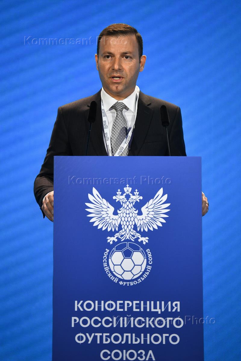 Conference of the Russian Football Union (RFU) at the Lotte Hotel Moscow. President of the Russian Football Union, Chairman of the Board, CEO of PJSC Gazprom Neft Alexander Dyukov during the conference.