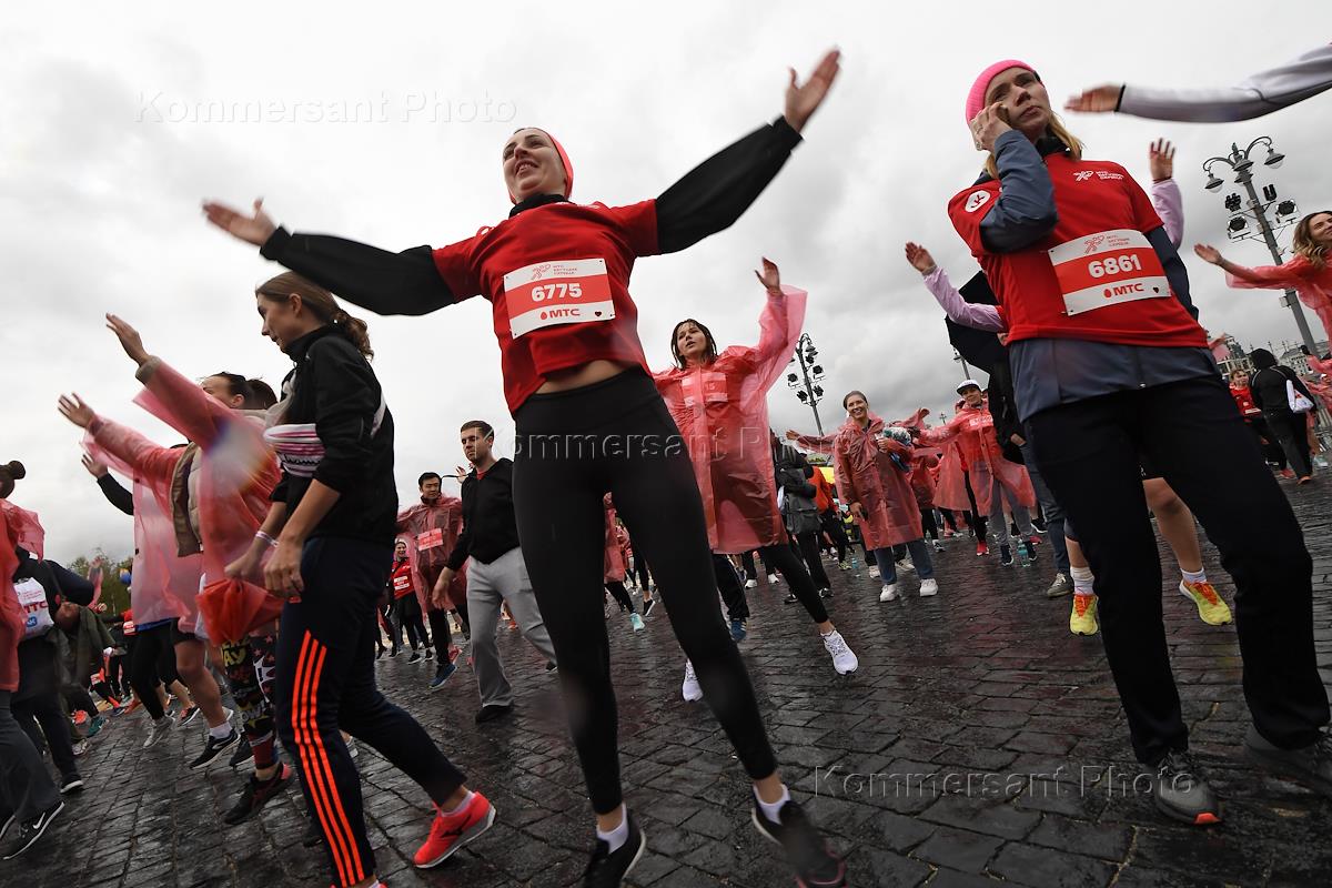 Благотворительный забег МТС Бегущие сердца-2022 под девизом #БежимСоСмыслом! стартовал на Васильевском спуске. Участники во время разминки перед забегом.