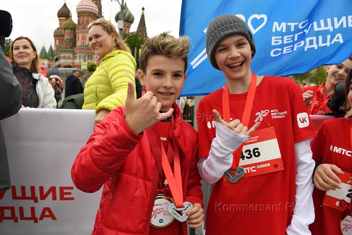 Благотворительный забег МТС Бегущие сердца-2022 под девизом #БежимСоСмыслом! стартовал на Васильевском спуске. Участники на финише.