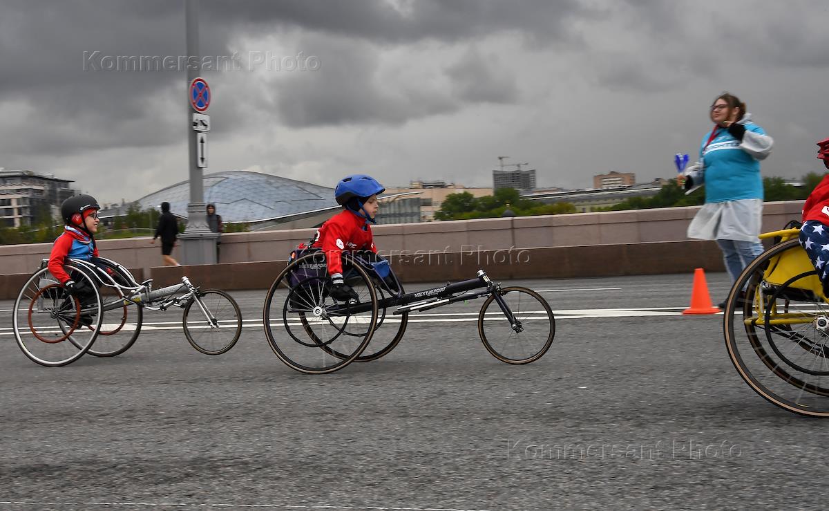 MTS Charity Run Running Hearts-2022 under the motto #RunWithMeaning! started on Vasilyevsky Spusk. Participants are wheelchair users and employees of the escort service at a distance.