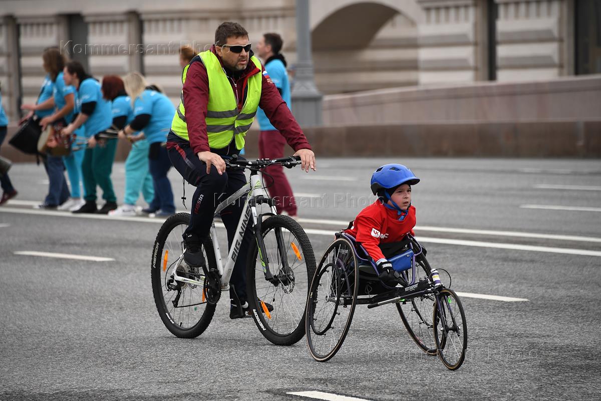 MTS Charity Run Running Hearts-2022 under the motto #RunWithMeaning! started on Vasilyevsky Spusk. Participants are wheelchair users and employees of the escort service at a distance.