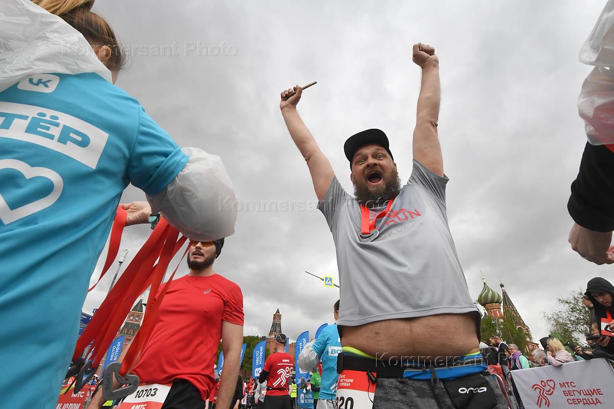 Благотворительный забег МТС Бегущие сердца-2022 под девизом #БежимСоСмыслом! стартовал на Васильевском спуске. Участники на финише.