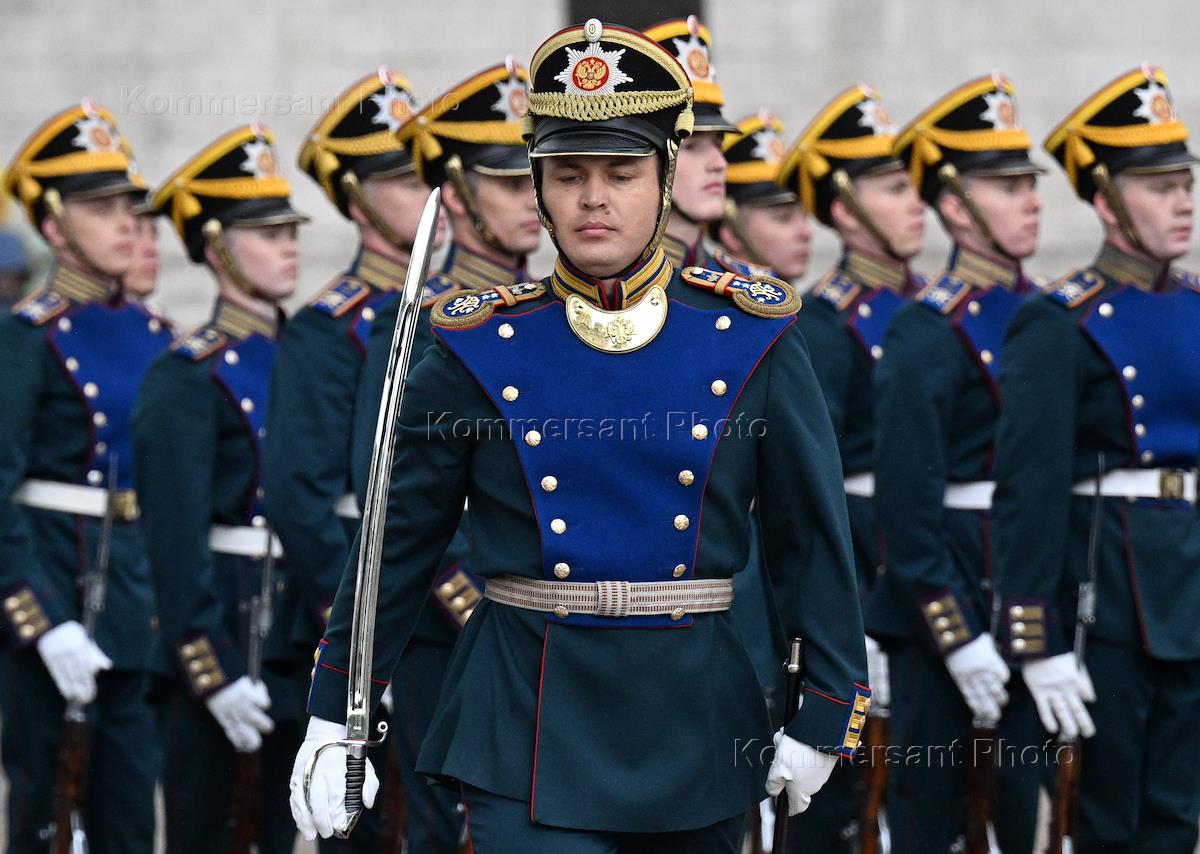 Ceremony of disengagement of foot and horse guards of the Presidential Regiment on the Cathedral Square of the Moscow Kremlin. Soldiers during the ceremony.