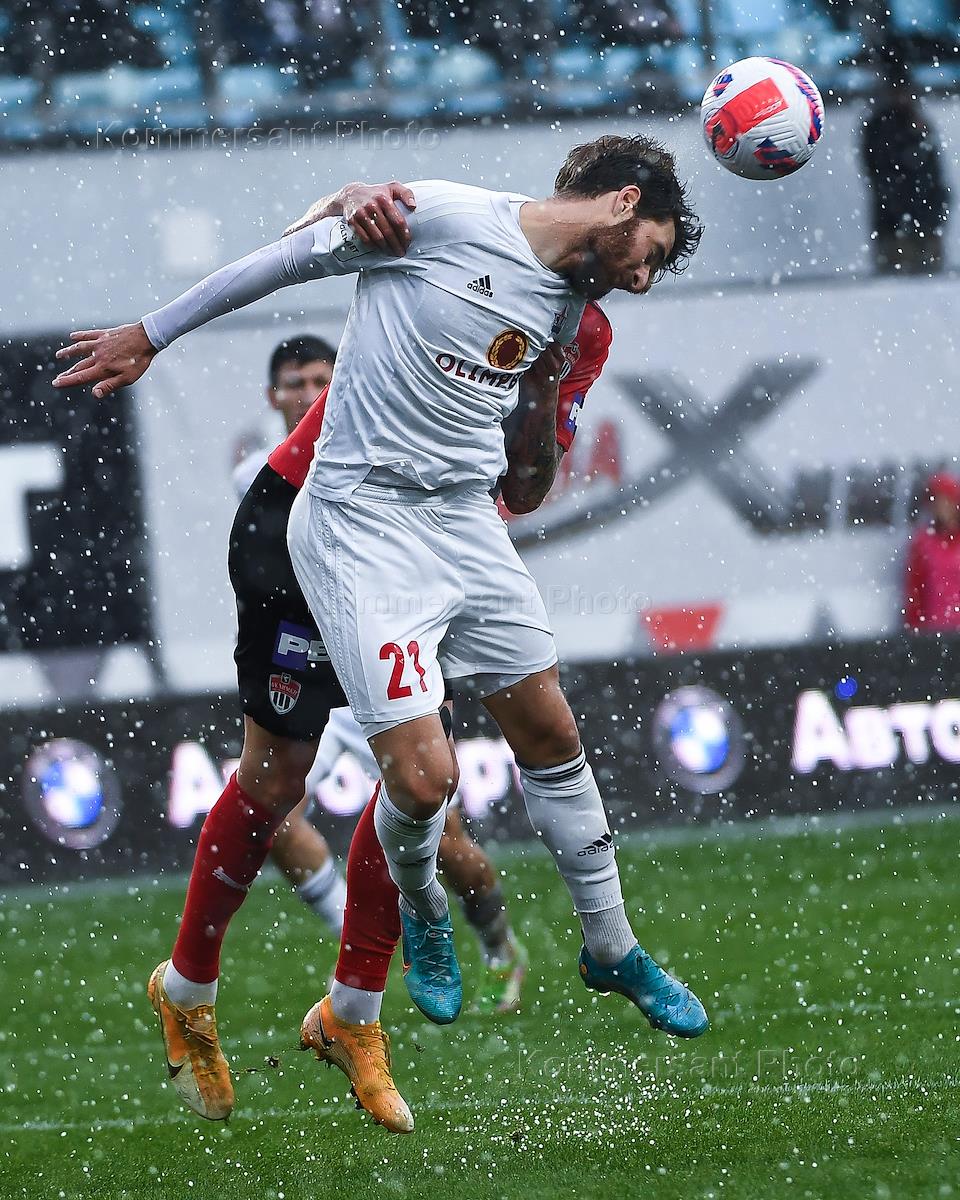 Transitional tournament of the Russian Premier League (RPL). Match between the teams "Khimki" (Khimki) - "SKA-Khabarovsk" (Khabarovsk) at the stadium "Khimki Arena". Khimki team player Zakhar Volkov (right) during a match.
