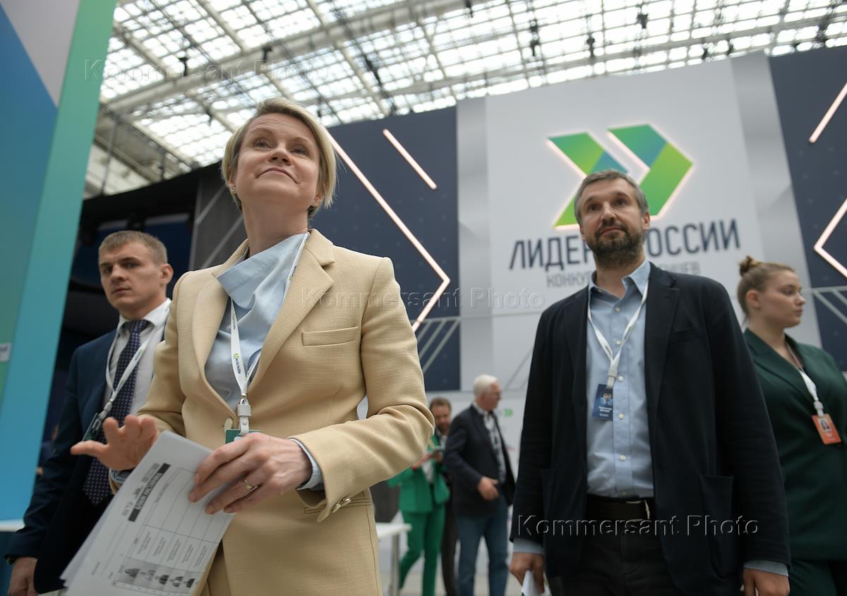 Суперфинал четвертого сезона конкурса управленцев "Лидеры России" – флагманского проекта президентской платформы "Россия – страна возможностей" в Гостином дворе. Руководитель образовательного центра "Сириус", член президиума Совета при президенте России по науке и образованию Елена Шмелева (в центре) во время конкурса.