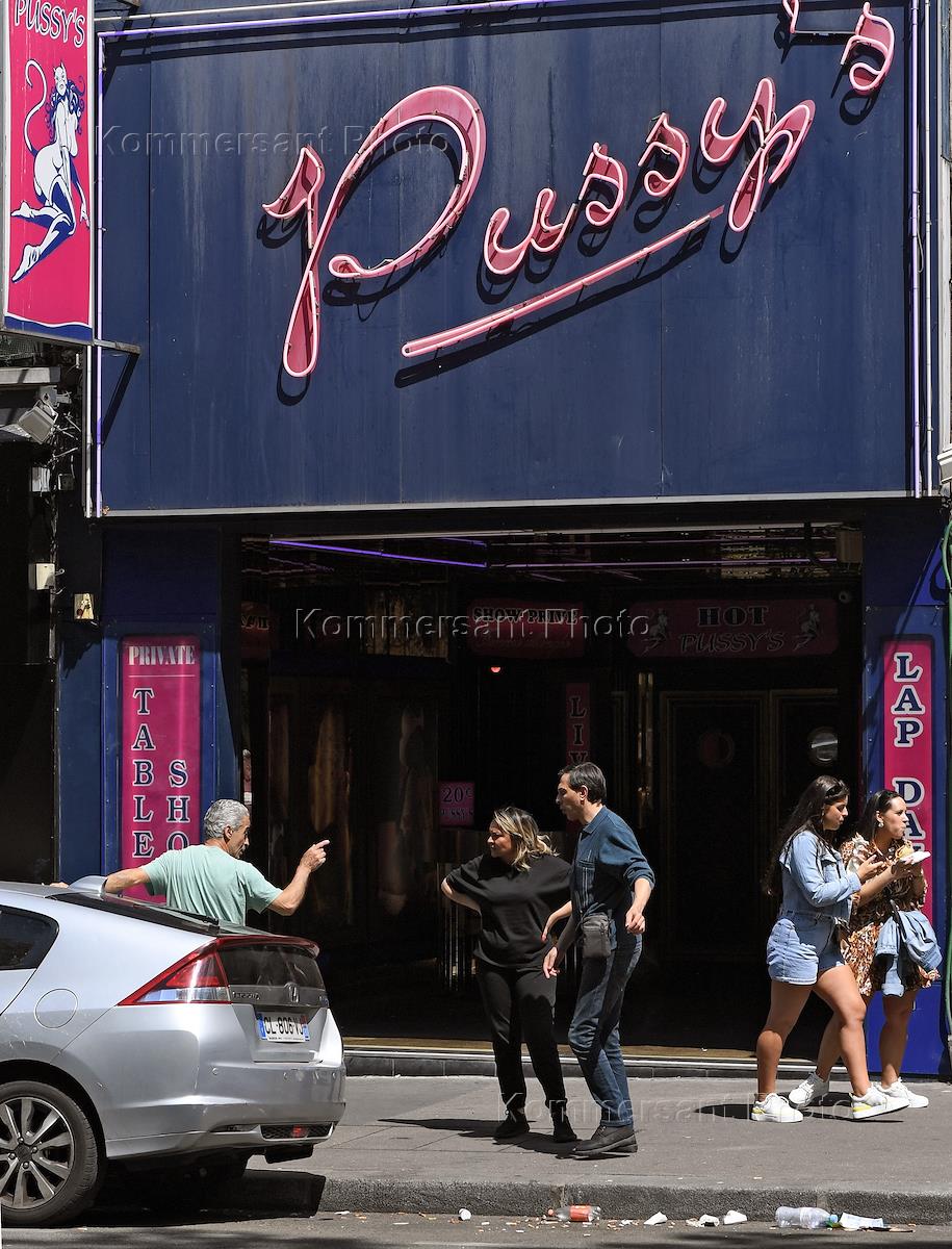 Views of Paris. Genre photography. Passers-by at the entrance to the Pussy's strip club.