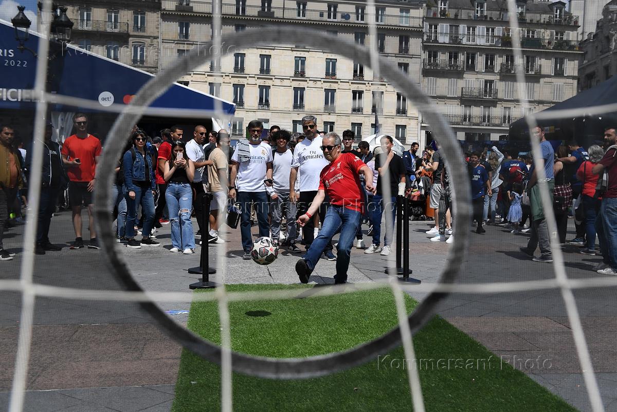 UEFA Champions League Final. Match between teams "Liverpool" (England, Liverpool) - "Real Madrid" (Spain, Madrid). The Champions League final was supposed to be held in St. Petersburg, but UEFA representatives moved it to France in connection with the special military operation of the Russian Armed Forces in Ukraine. Genre photography. Football fans in the fan zone before the start of the match.