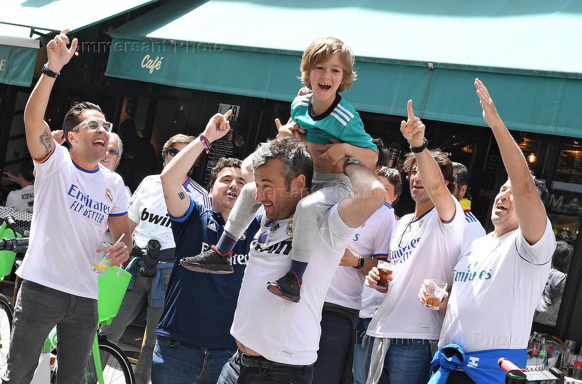 UEFA Champions League Final. Match between teams "Liverpool" (England, Liverpool) - "Real Madrid" (Spain, Madrid). The Champions League final was supposed to be held in St. Petersburg, but UEFA representatives moved it to France in connection with the special military operation of the Russian Armed Forces in Ukraine. Genre photography. Football fans of the Real Madrid team in the fan zone before the start of the match.