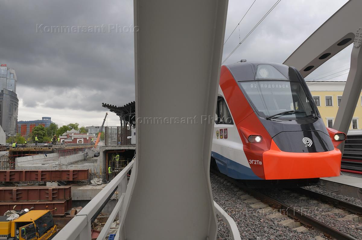 Views of Moscow. Suburban electric train while traveling along the Kalanchevskoye overpass on Komsomolskaya Square ("Three Stations Square").