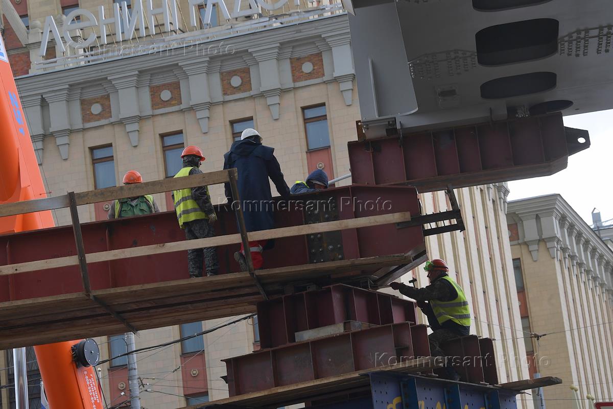 The process of sliding the largest arch of the Kalanchevsky overpass on Komsomolskaya Square ("Three stations square"), which will become part of the double-track overpass.