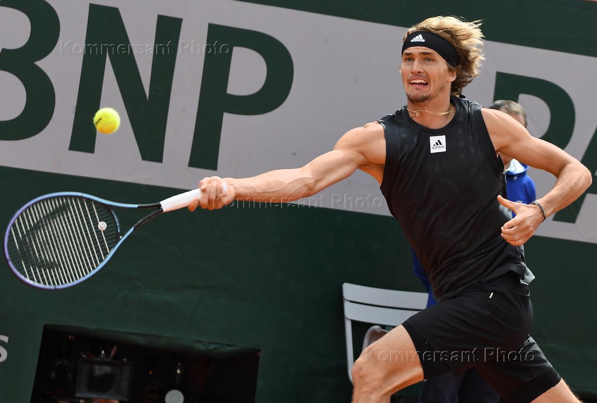 Чемпионат Франции по теннису "Ролан Гаррос" 2022 (Roland Garros 2022). Четвертый круг. Немецкий теннисист Александр Зверев во время матча с испанским теннисистом Бернабе Сапата-Миральесом.