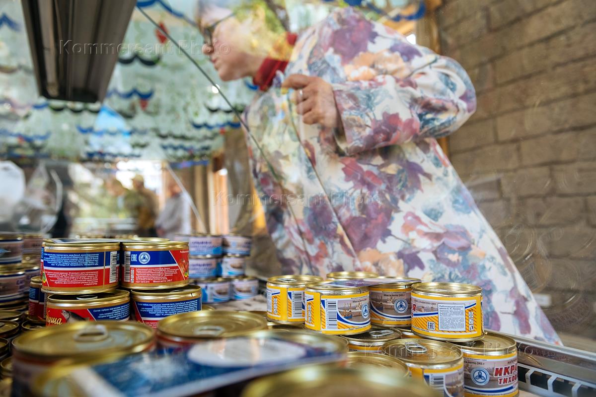 Gastronomic festival "Fish week 2022". A counter with canned fish at the festival site in the 16th microdistrict of Zelenograd.