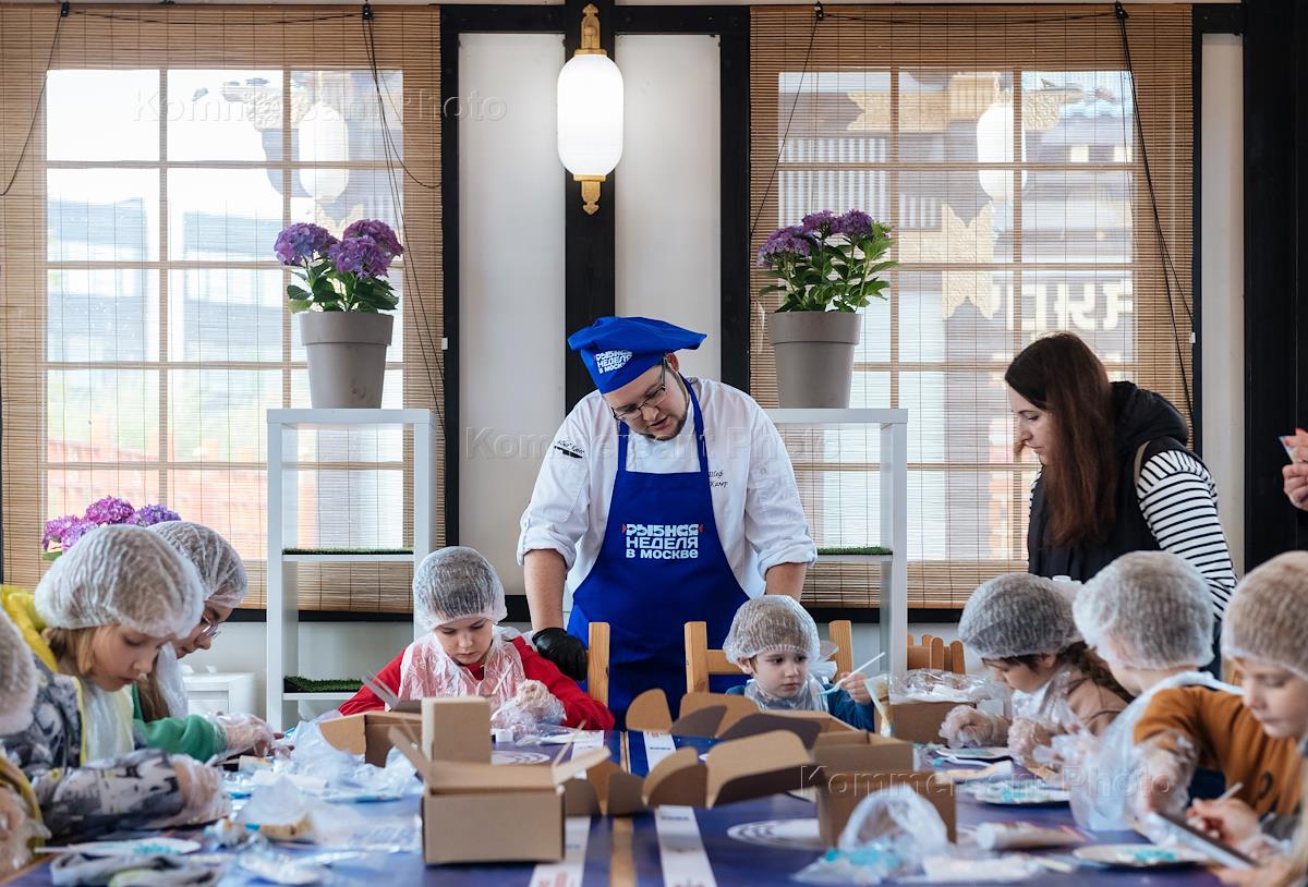 Gastronomic festival "Fish week 2022". A chef during a children's master class at the festival site in the Kurkino district.