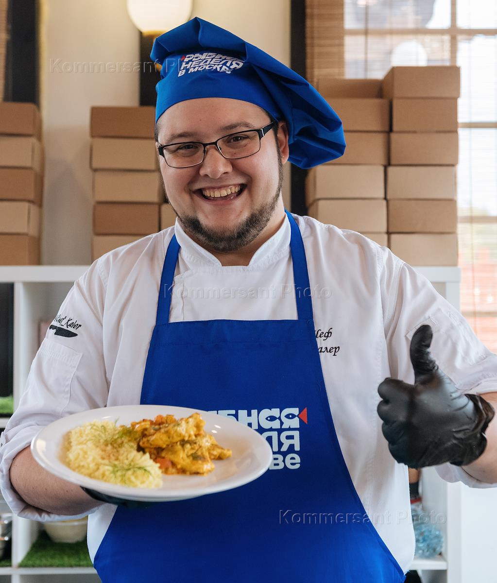 Gastronomic festival "Fish week 2022". A chef during a children's master class at the festival site in the Kurkino district.