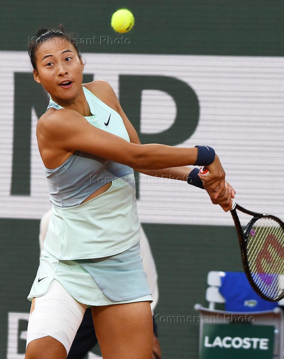 Чемпионат Франции по теннису "Ролан Гаррос" 2022 (Roland Garros 2022). Четвертый круг. Китайская теннисистка Чжэн Циньвэнь во время матча с польской теннисисткой Игой Швентек.