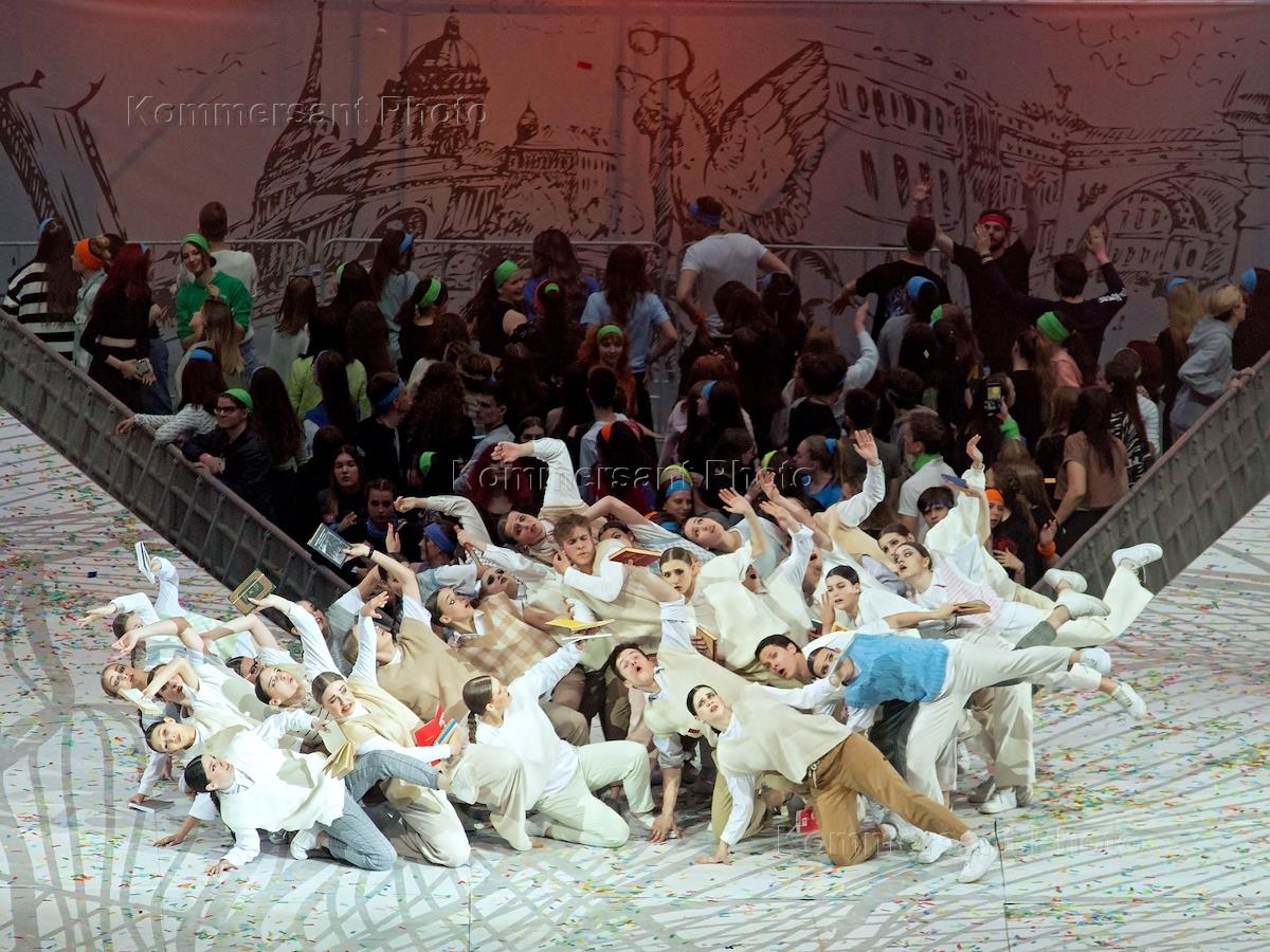 Фестиваль "Петровские Ассамблеи 2.0", посвященный 350-летию Петра Первого и Дню города, прошел на стадионе "Газпром Арена". Участники концерта во время выступления.