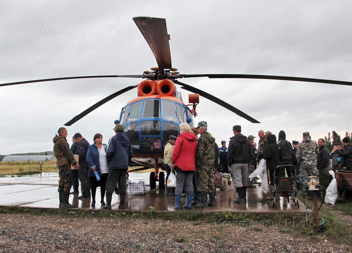 Genre photography. Turukhansk airport. Boarding passengers in the Mi-8 helicopter.