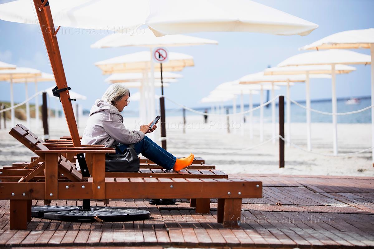 Beaches of the Baltic Sea. Preparing for the holiday season. Genre photography. A woman is sitting on a sun lounger on the beach.