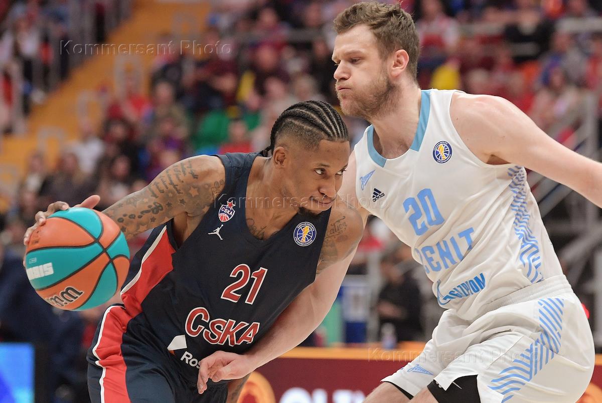 VTB United Basketball League. The final. Match between the teams of CSKA (Moscow) - "Zenit" (St. Petersburg) at the stadium "Megasport". Zenit team player Andrey Zubkov (right) and CSKA team player Will Clyburn (left) during the match.