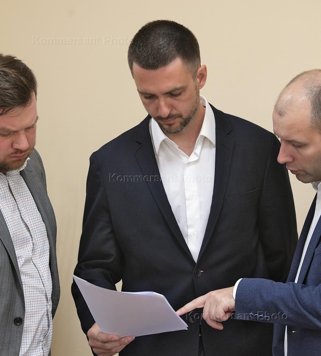 Рассмотрение уголовного дела бывших заместителя генерального директора по безопасности АО НРТБ Александра Лежнева и его подчиненного Александра Золотых, бывшего сотрудника ФСБ России Ивана Шумигая и заместителя прокурора 231-й военной прокуратуры Московского гарнизона Александра Вашурина, обвиняемых в попытке хищения у АО "Национальное радиотехническое бюро" (НРТБ), связанного с исполнением государственного оборонного заказа (ГОЗ), около 100 млн руб., в 235-м гарнизонном военном суде. Бывший заместитель генерального директора по безопасности АО НРТБ Александр Лежнев (слева) и бывший сотрудник ФСБ России Иван Шумигай (в центре) во время заседания суда.