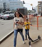 Views of Nizhny Novgorod. Genre photography. A woman with a girl on a scooter in the city center.