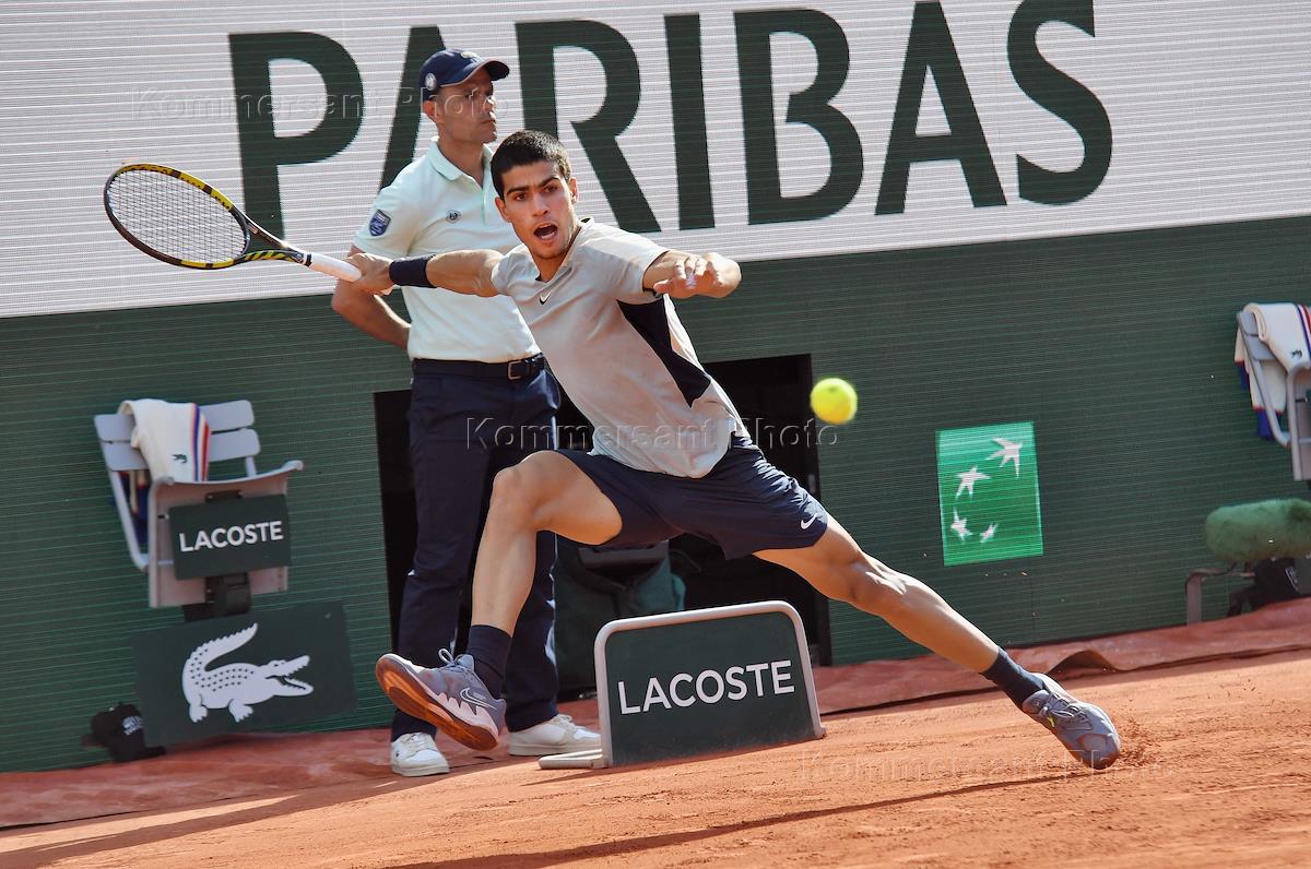 French Tennis Championship "Roland Garros" 2022. Quarterfinal. Spanish tennis player Carlos Alcaraz during a match with German tennis player Alexander Zverev.
