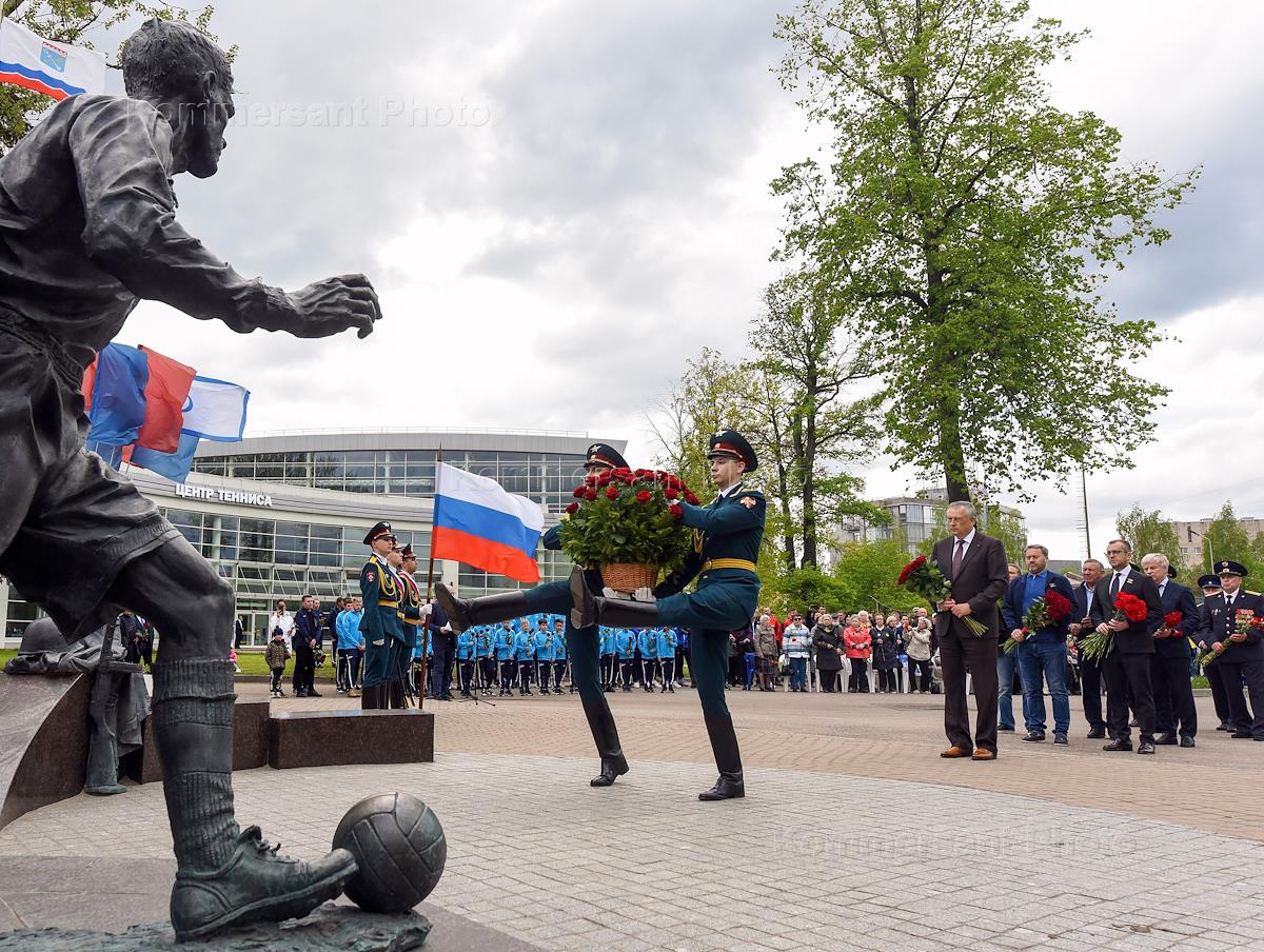 Мероприятие, посвященное 80-й годовщине проведения в мае 1942 года в блокадном Ленинграде футбольного матча на стадионе "Динамо". Губернатор Ленинградской области - председатель Правительства Ленинградской области Александр Дрозденко во время церемонии возложения цветов к памятнику футболистам на стадионе.