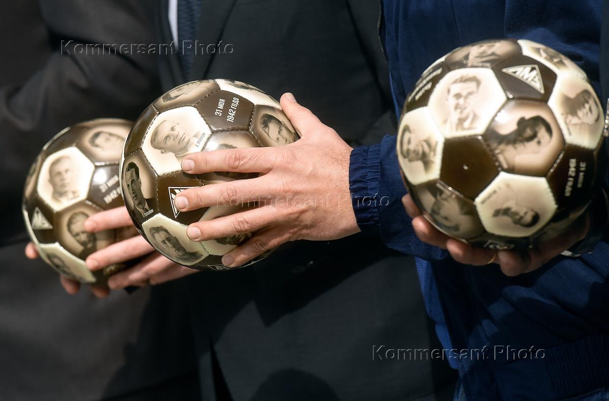 Мероприятие, посвященное 80-й годовщине проведения в мае 1942 года в блокадном Ленинграде футбольного матча на стадионе "Динамо". Жанровая фотография. Футбольный мяч с портретами участников матча 1942 года.