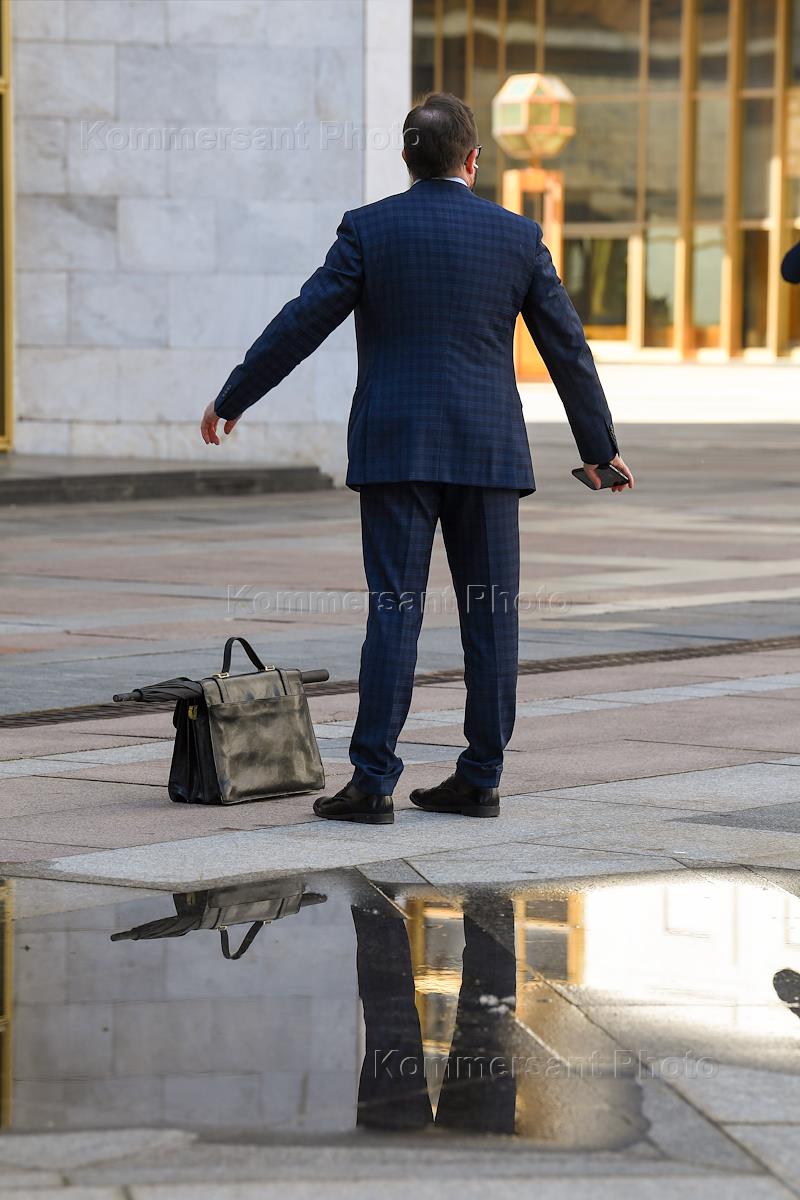 Elections of Academicians of the Russian Academy of Sciences (RAS) and Corresponding Members of the Russian Academy of Sciences in the Russian Academy of Sciences. Genre photography. A man with a briefcase on the square near the building of the Russian Academy of Sciences.