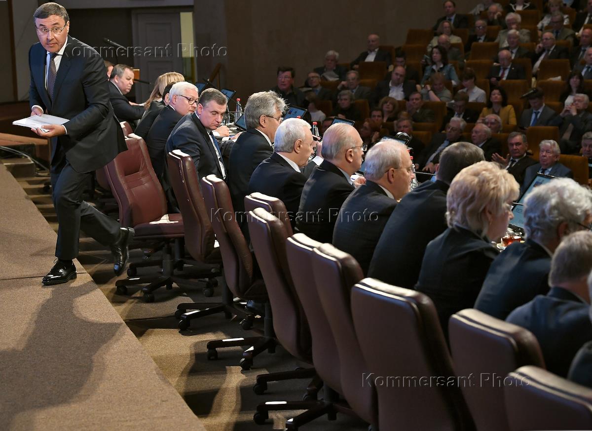 Выборы академиков Российской академии наук (РАН) и членов-корреспондентов РАН в Российской Академии Наук. Президент РАН Александр Сергеев (в центре) во время выборов.