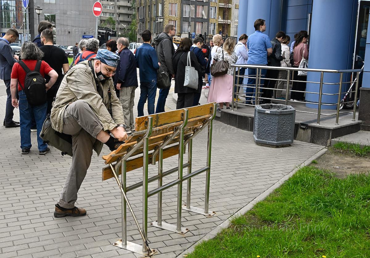 Заседание по делу муниципального депутата Алексея Горинова, обвиняемого в распространении фейков "группой лиц" "по предварительному сговору" и "по мотивам политической ненависти", в Мещанском районном суде. Адвокат Михаил Бирюков у здания суда.