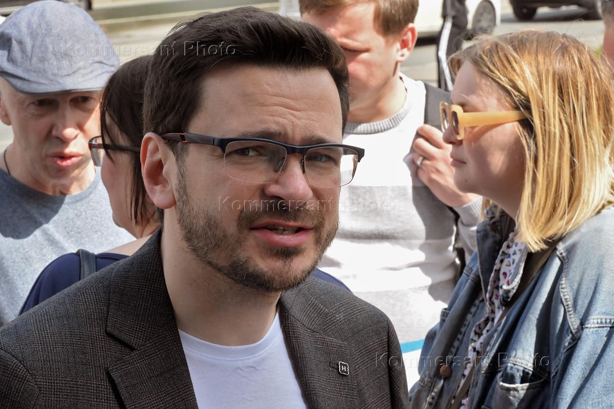 Заседание по делу муниципального депутата Алексея Горинова, обвиняемого в распространении фейков "группой лиц" "по предварительному сговору" и "по мотивам политической ненависти", в Мещанском районном суде. депутат Московской городской думы Михаил Тимонов у здания суда.