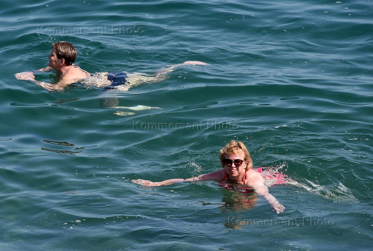 Holiday season in Crimea. Genre photography. Vacationers on the beach of Alushta.