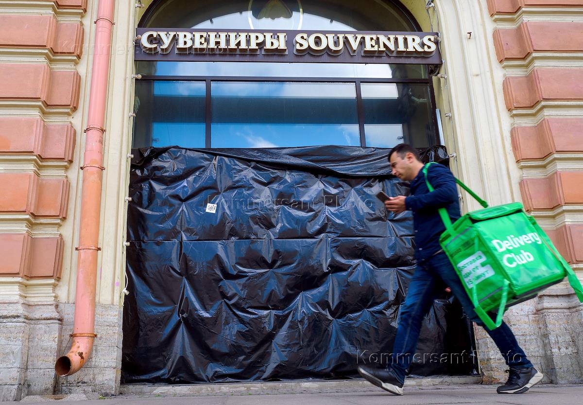 Views of St. Petersburg. Genre photography. Delivery clab food delivery courier and indoor gift shop.