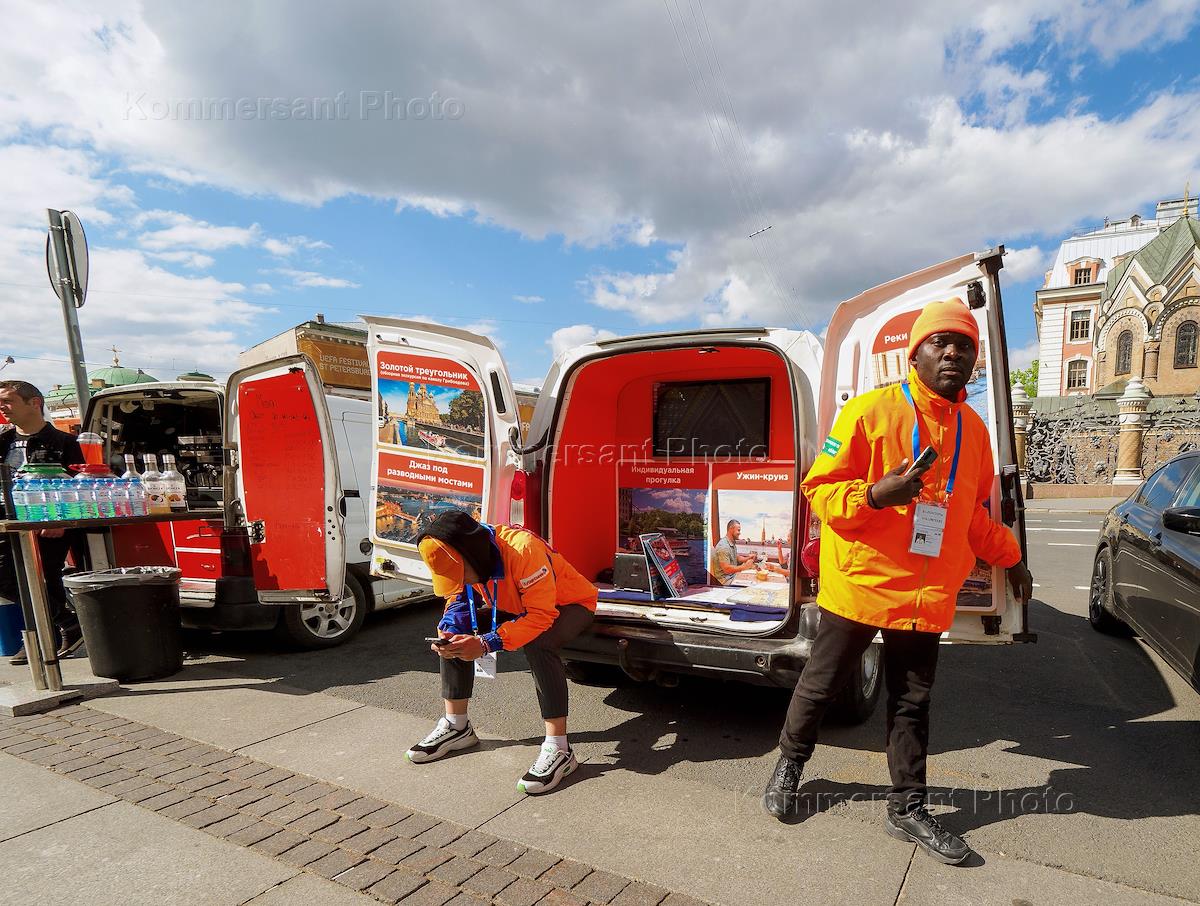 Views of St. Petersburg. Genre photography. Advertisement for a tour desk on the embankment of the Griboyedov Canal.