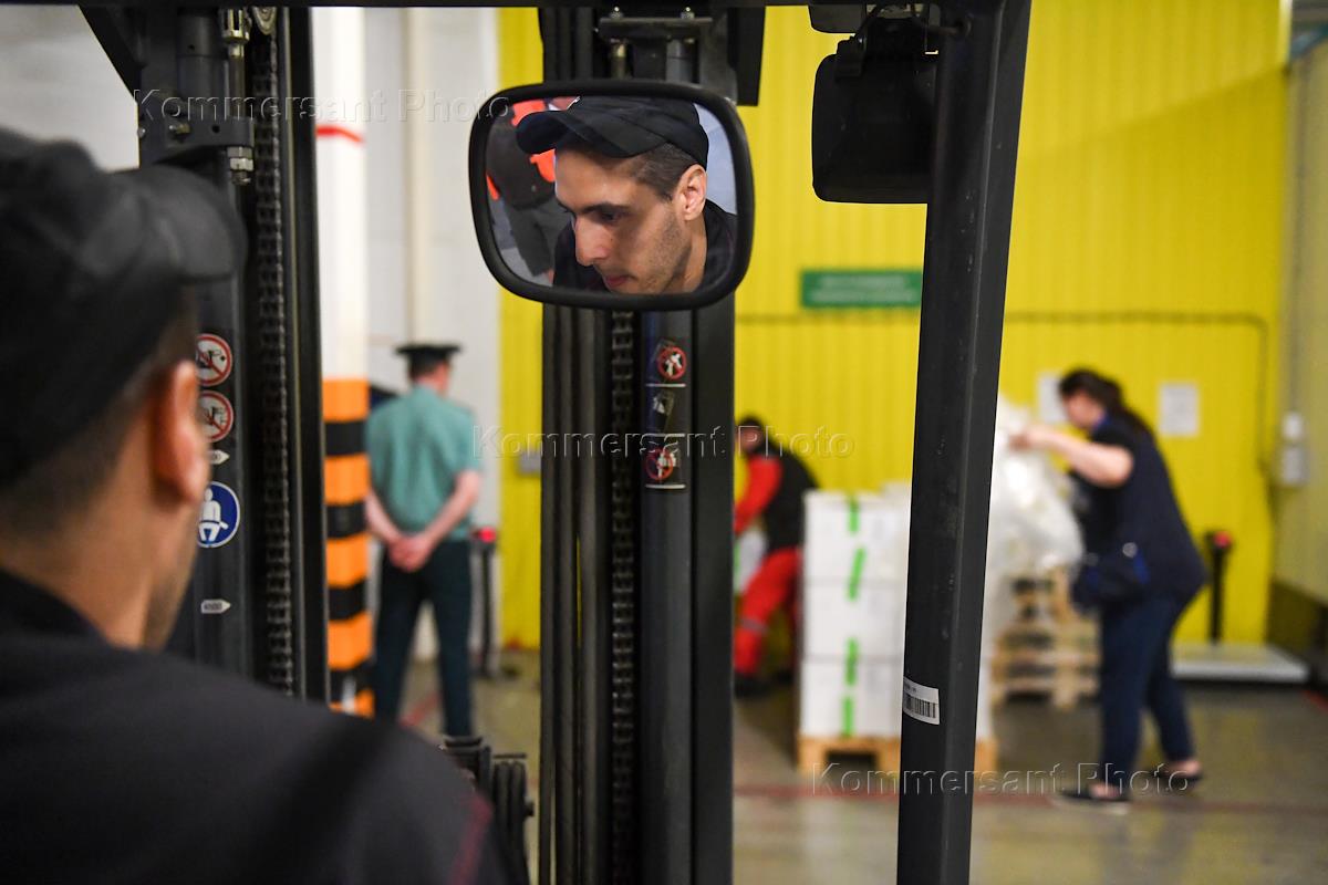 Работа Давыдовского таможенного поста. Сотрудники поста на складе растаможенного товара во время разгрузки автомобиля.